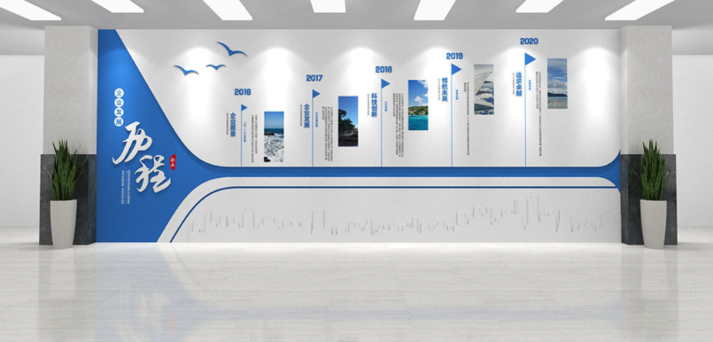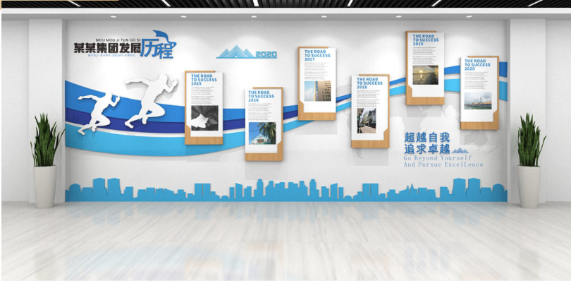 其次在公司的發(fā)展過程,這些年下來我們肯定取得了很多進步以及榮譽,比如公司一開始5個人創(chuàng)業(yè)。到現(xiàn)在100人左右,經(jīng)過這幾年的時間,每一年我們新增員工多少人,新增部門多少個,員工的榮譽以及公司的榮譽有哪些,我們公司的產(chǎn)品更替有哪些重要時間點,以及公司的經(jīng)營理念變更都可以寫入我們的歷史文化墻,所謂歷史就是記錄一些比較深刻值得記下來的事情。用圖文的形式進行完美的展示,重大事件還可以用不同的顏色來進行設(shè)計,在我們同類色彩的搭配上再加上突出的顏色,會顯得非常有條理性。